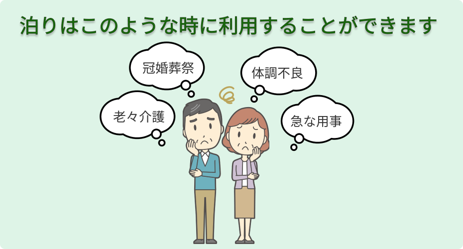 事前の予約がない場合でも、空いているお部屋があれば急な宿泊が可能です。ご利用者は日中通い慣れた場所で過ごす事ができ、顔なじみの職員が夜勤を担当するため、安心して宿泊していただけます。
